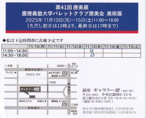 - 場 所 :銀座 ギャラリー暁 (商工聯合会ビル2F) 東京メトロ銀座線銀座駅 A3より徒歩4分